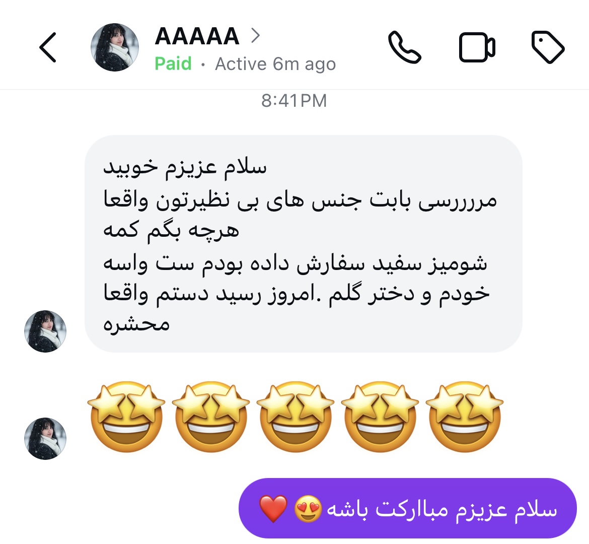 مریم از تهران: کیفیت لباسها عالی بود و ارسال خیلی سریع انجام شد. ممنون از پشتیبانی خوبتون! 🌸